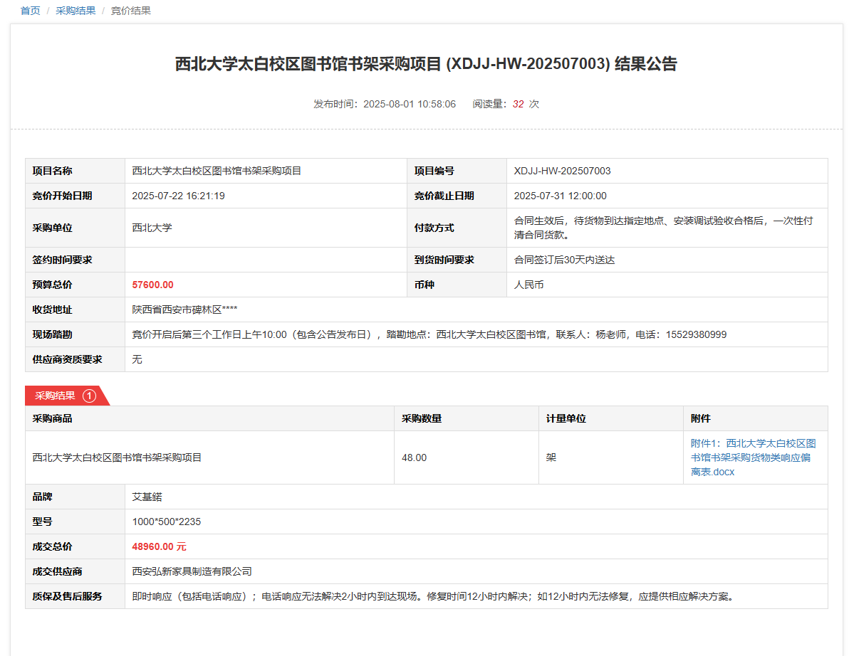 球速体育·(中国)官方网站QIUSU SPORTS太白校区图书馆阅览桌椅采购项目(XDJJ-HW-202507004)竞价结果公告