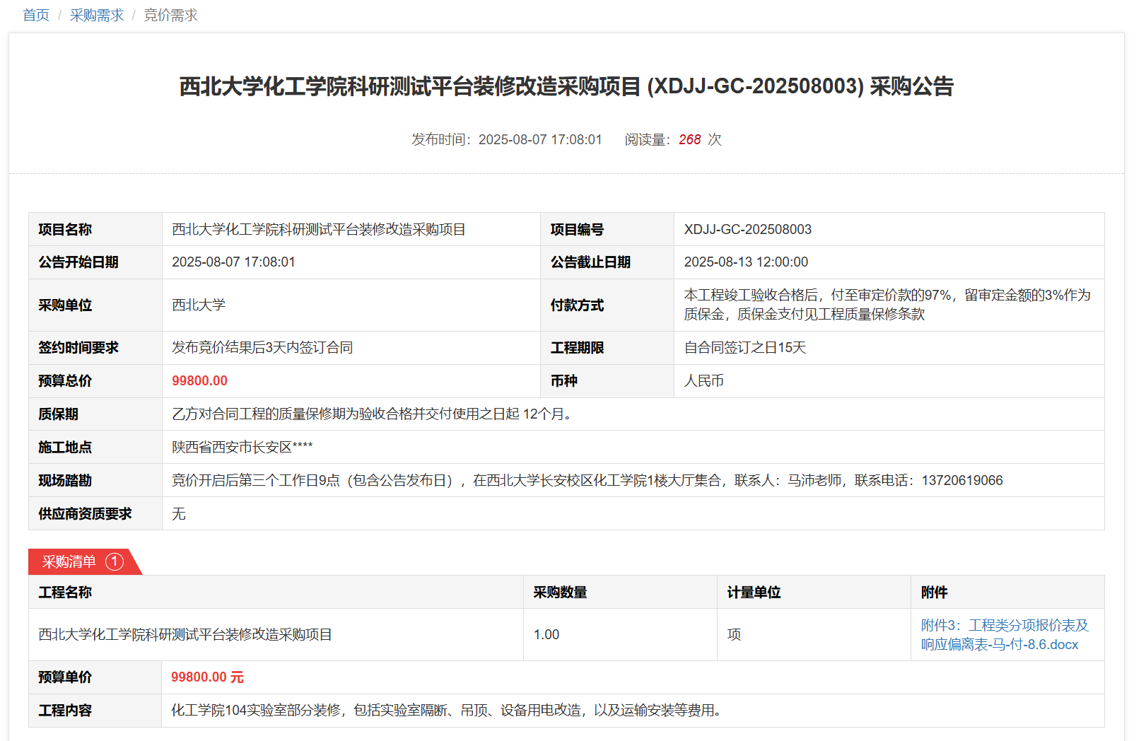 球速体育·(中国)官方网站QIUSU SPORTS化工学院科研测试平台装修改造采购项目(XDJJ-GC-202508003)竞价采购公告 作者:采购与招标办公室 编辑: 时间:2025-08-07 原公告链接