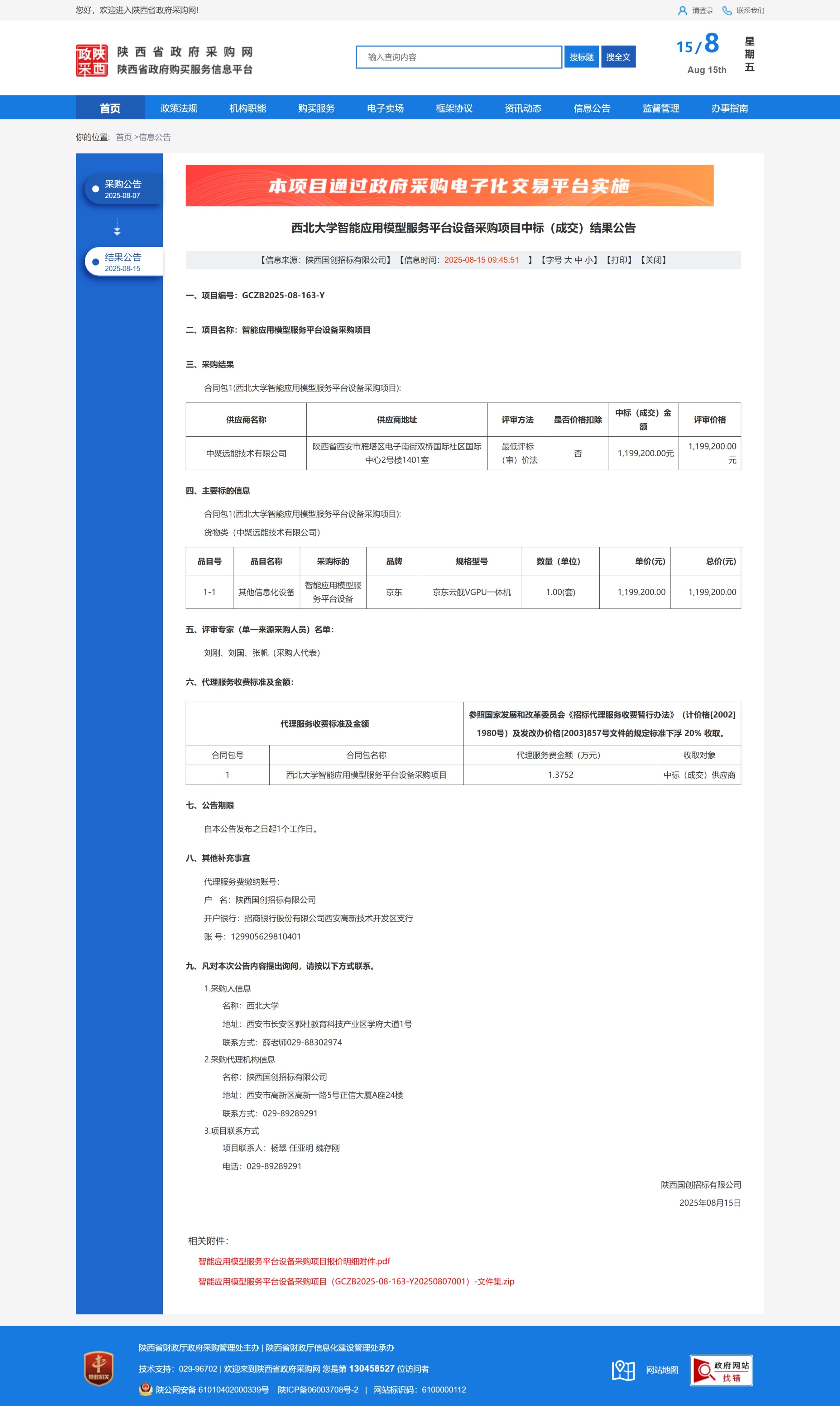 球速体育·(中国)官方网站QIUSU SPORTS智能应用模型服务平台设备采购项目中标(成交)结果公告 作者: 编辑:采购与招标办公室 时间:2025-08-15 原公告链接:https://www.ccgp-shaanxi.gov.cn/freecms/site/shaanxi/ggxx/info/2025/8a69c4d59860f6420198ab5332c37fcf.html?noticeType=001023¬iceId=a3a64a26-797b-11f0-8063-08c0eb20c666