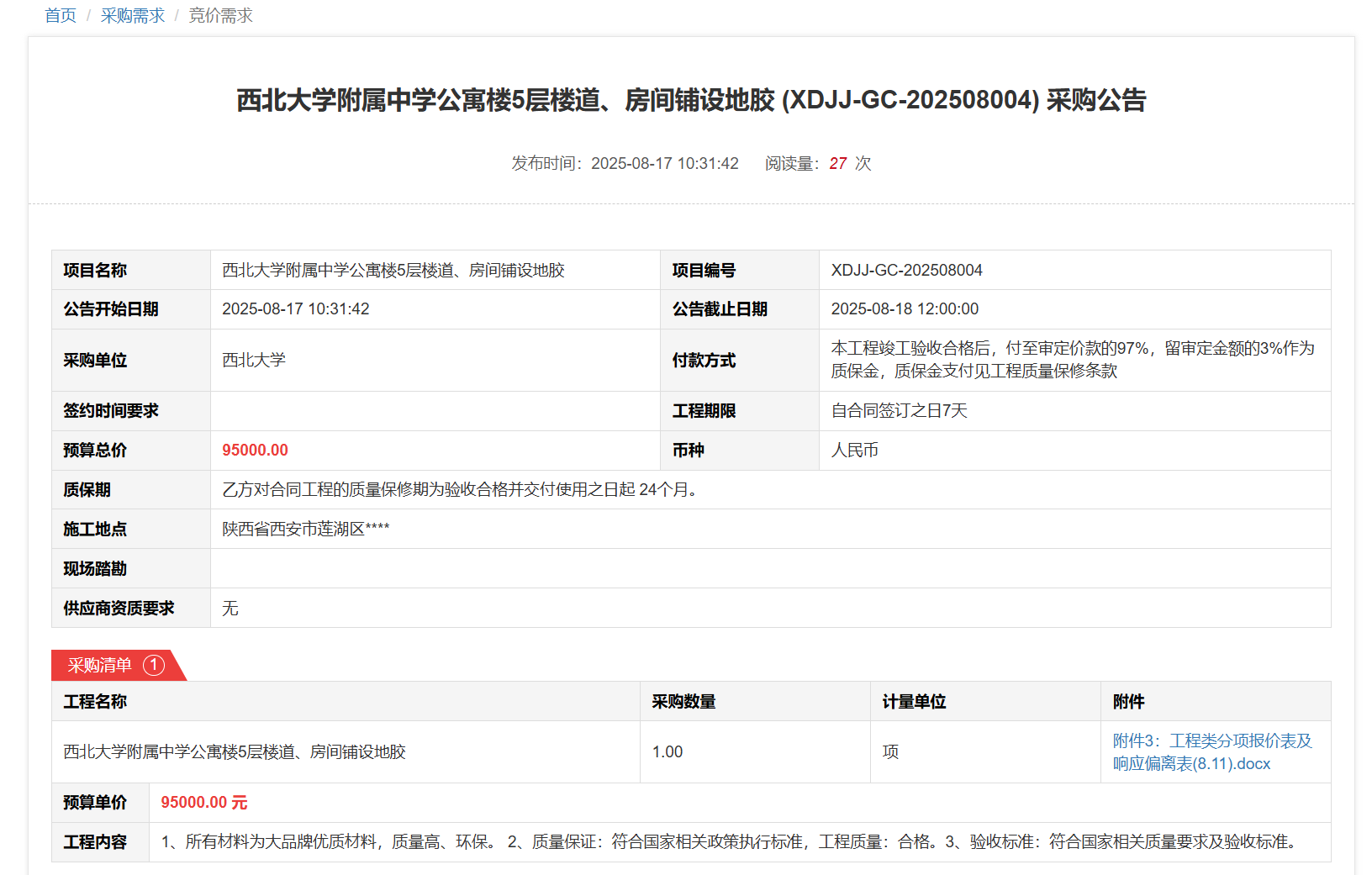 球速体育·(中国)官方网站QIUSU SPORTS附属中学公寓楼5层楼道、房间铺设地胶(XDJJ-GC-202508004)竞价采购公告 作者:采购与招标办公室 编辑: 时间:2025-08-17 原公告链接
