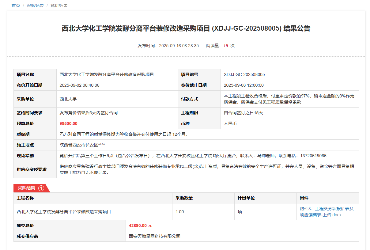 球速体育·(中国)官方网站QIUSU SPORTS化工学院发酵分离平台装修改造采购项目(XDJJ-GC-202508005)竞价结果公告 作者:国有资产管理处 编辑: 时间:2025-09-16 原公告链接