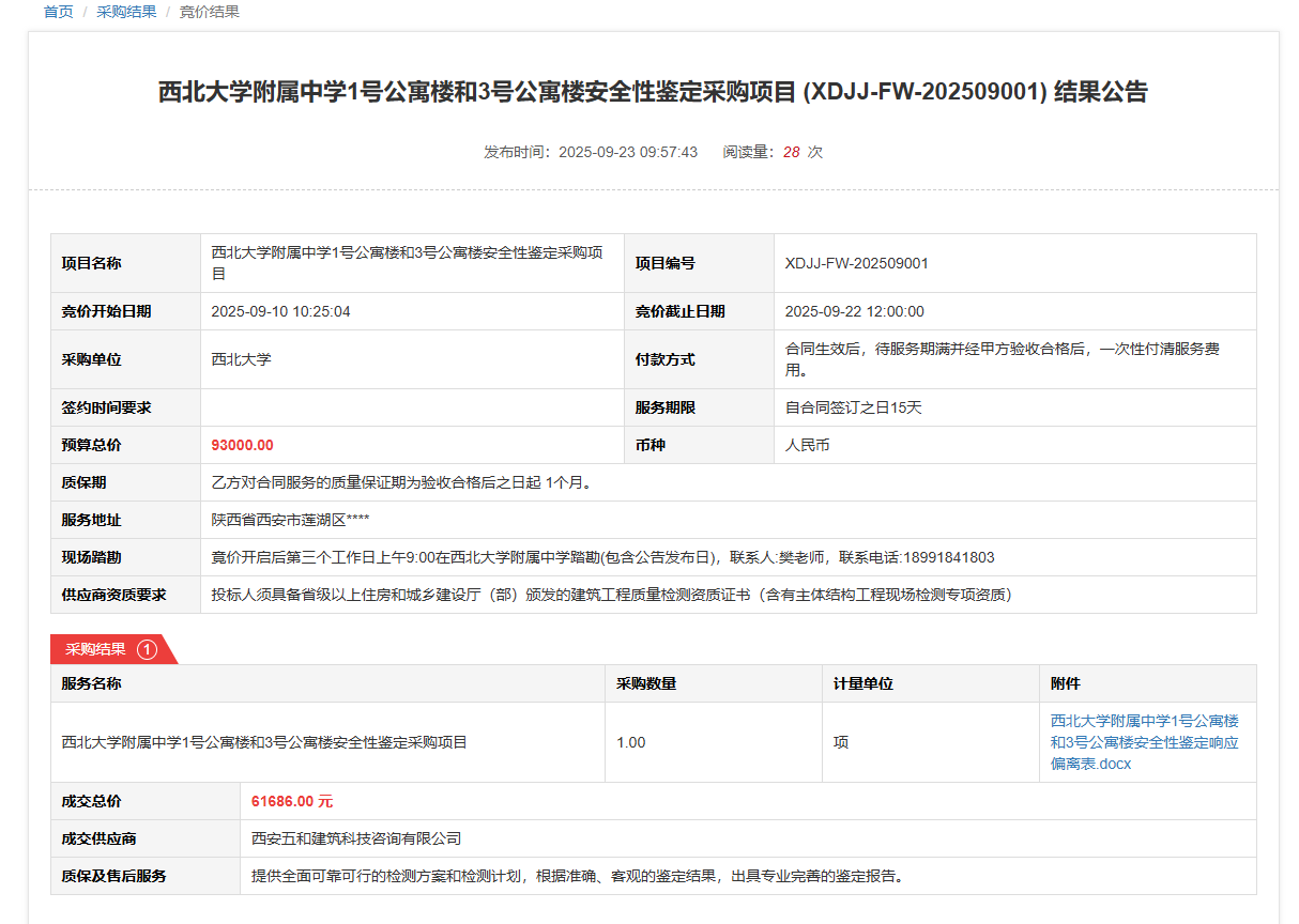 球速体育·(中国)官方网站QIUSU SPORTS附属中学1号公寓楼和3号公寓楼安全性鉴定采购项目(XDJJ-FW-202509001)竞价结果公告 作者:国有资产管理处 编辑: 时间:2025-09-23 原公告链接