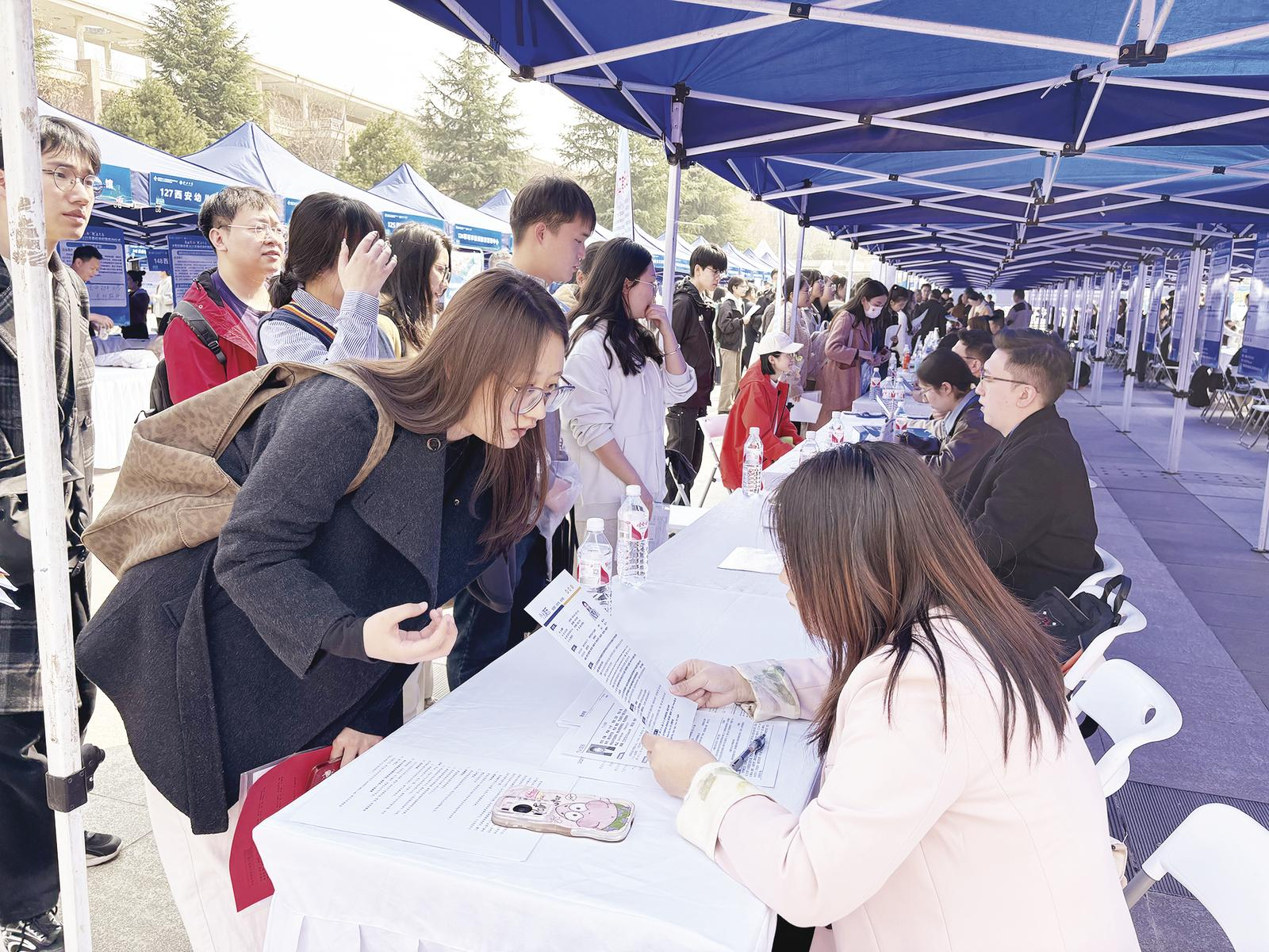 3月13日,“乐业陕西‘就’在三秦”大型招聘会暨2025 年春招进校园启动仪式在球速体育·(中国)官方网站QIUSU SPORTS长安校区举行。图为求职者向招聘单位工作人员咨询。