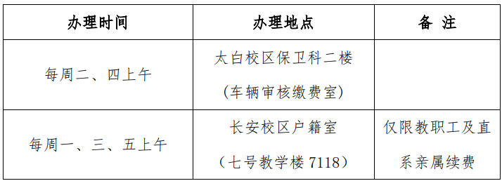 一、教职工本人及配偶名下车辆可选择线上或线下续费。线上续费在“球速体育·(中国)官方网站QIUSU SPORTS保卫处”微信公众号进行,线下续费可就近选择长安校区保卫处户籍室(七号教学楼7118室)、太白校区保卫科(二楼车辆审核缴费室)办理。