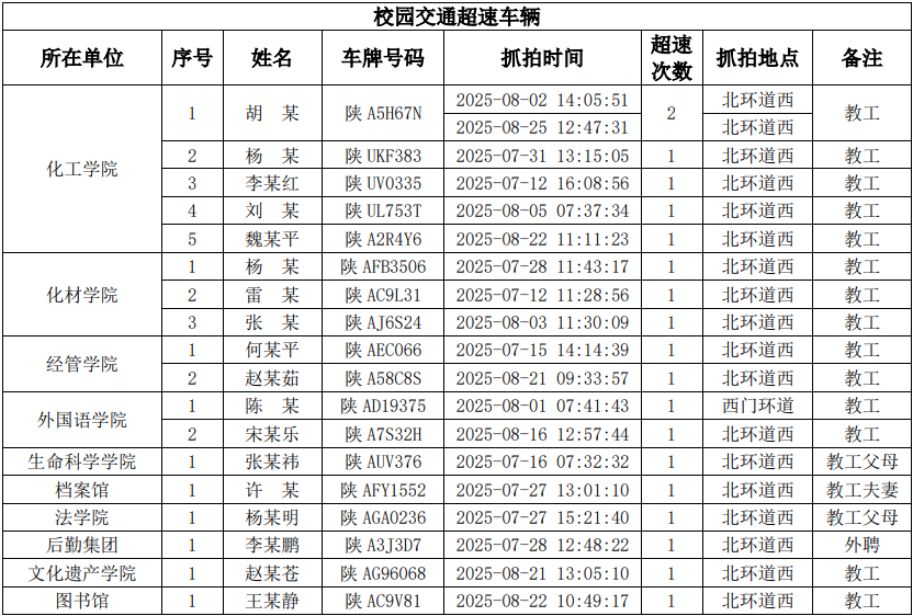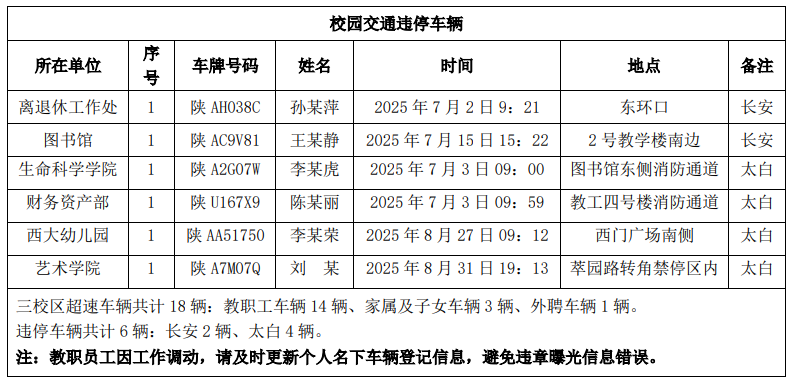 为进一步加强校园交通管理,保障校园交通安全有序,维护学校正常的教学、科研和生活秩序,切实保护师生员工的人身财产安全,根据《球速体育·(中国)官方网站QIUSU SPORTS校园交通安全管理规定》的相关要求,现将2025年7月-8月校园交通违章车辆予以曝光,具体要求与违章信息如下:
