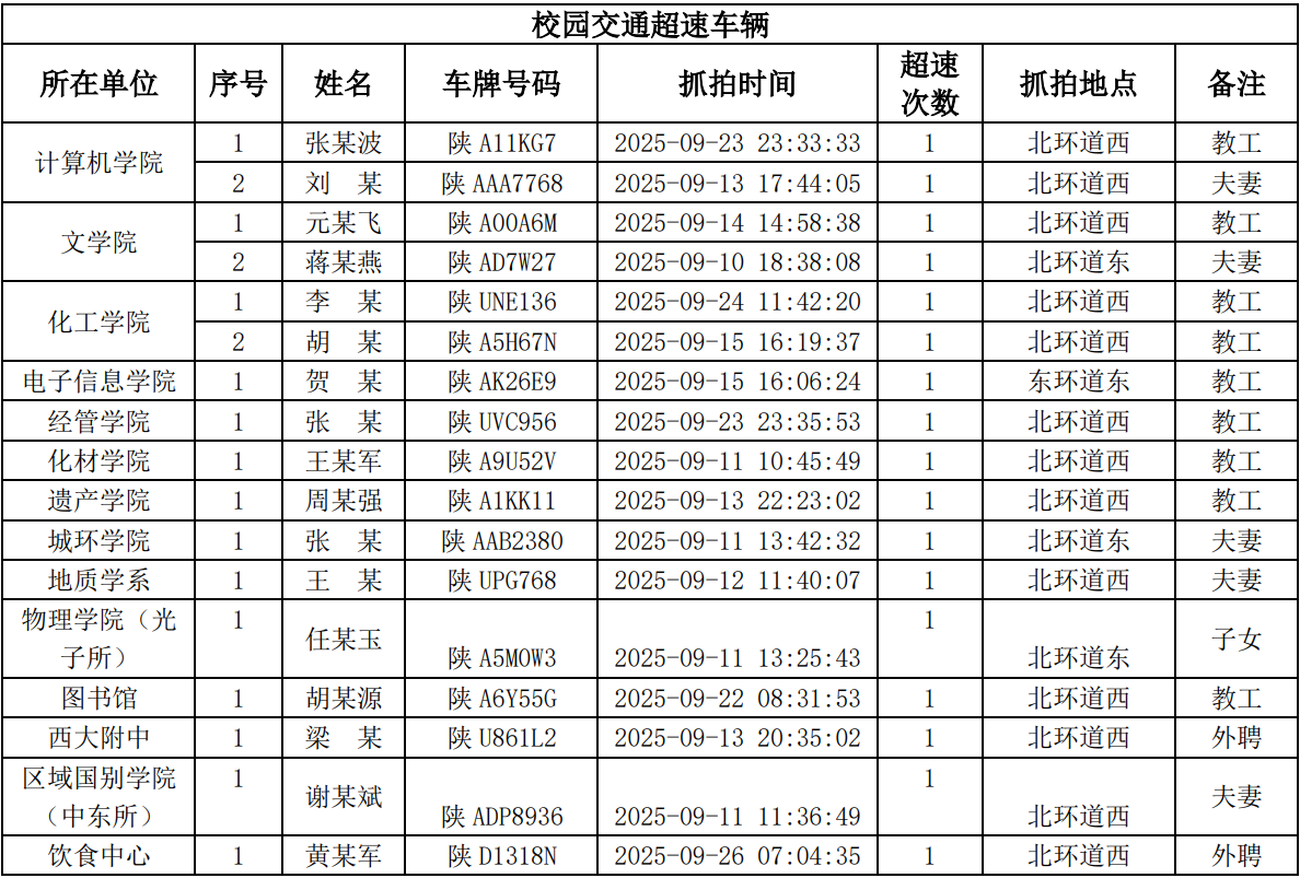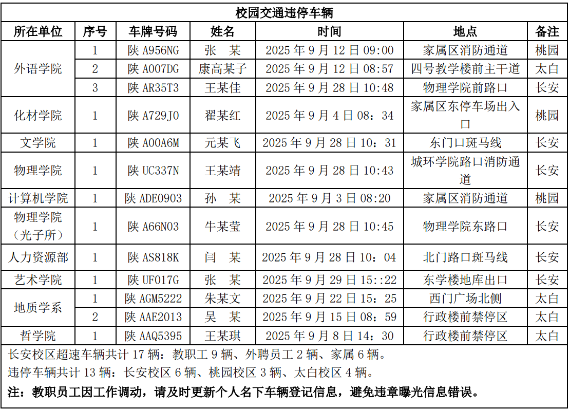 为进一步加强校园交通管理,保障校园交通安全有序,维护学校正常的教学、科研和生活秩序,切实保护师生员工的人身财产安全,根据《球速体育·(中国)官方网站QIUSU SPORTS校园交通安全管理规定》的相关要求,现将2025年9月校园交通违章车辆予以曝光,具体要求与违章信息如下: